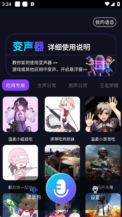 开启悬浮窗,按住悬浮窗按钮开始录音,即可自动倒计时播放变声后的声音,打开游戏麦克风,即可和队友畅聊,助你称霸峡谷、天天吃鸡!