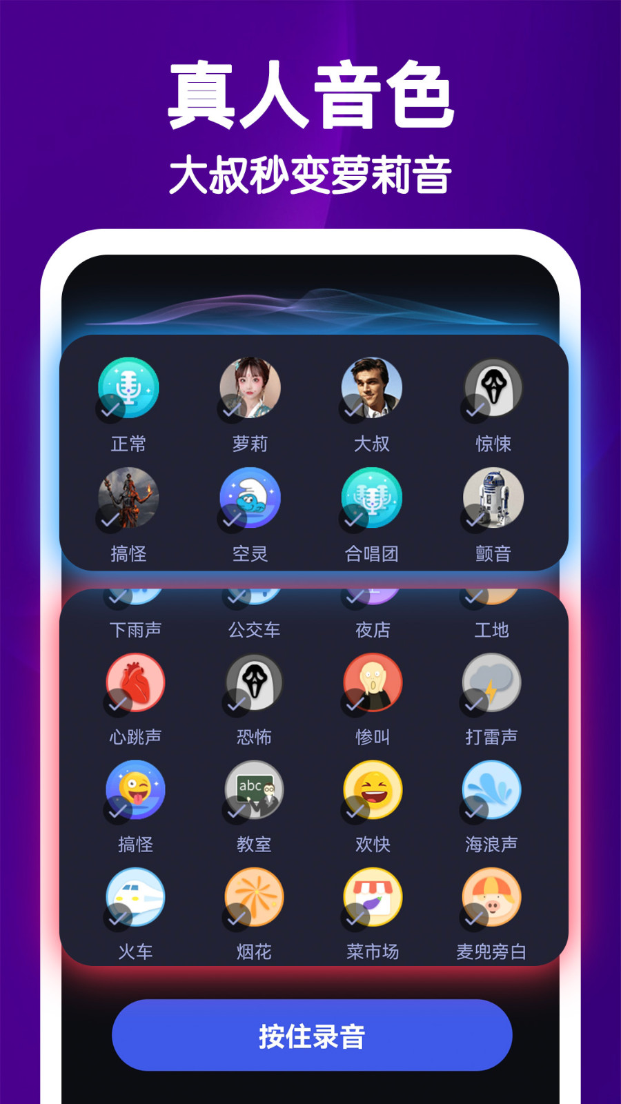 1、录音变声功能强大,支持多种趣味变声效果,如空灵、惊悚、萝莉、大叔、搞笑等。