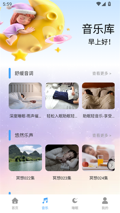 2、点击下方“音乐”选项,这里汇聚了众多助眠音乐资源。
