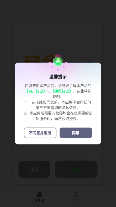 1、首次打开APP,阅读《服务条款》和《隐私政策》后,点击“同意”进入下一步,若“取消”则无法使用。