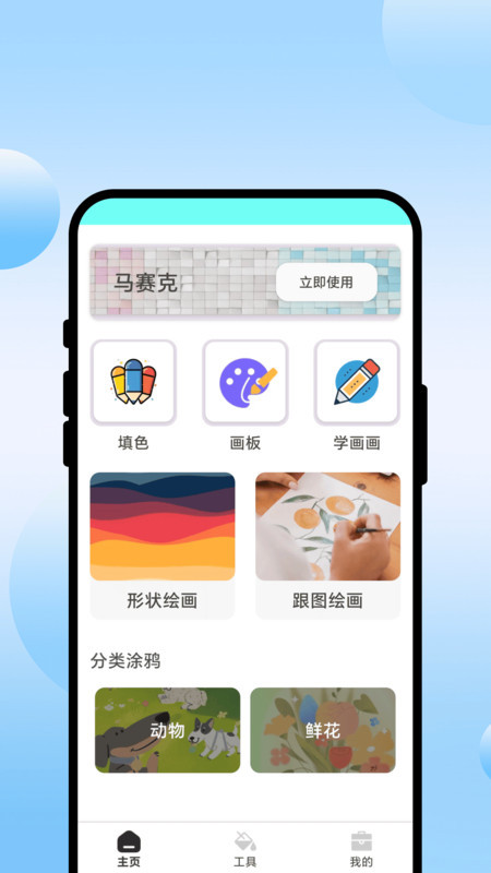 1、在主页中进行填色、画板、学画画、形状绘画以及跟图绘画等功能;