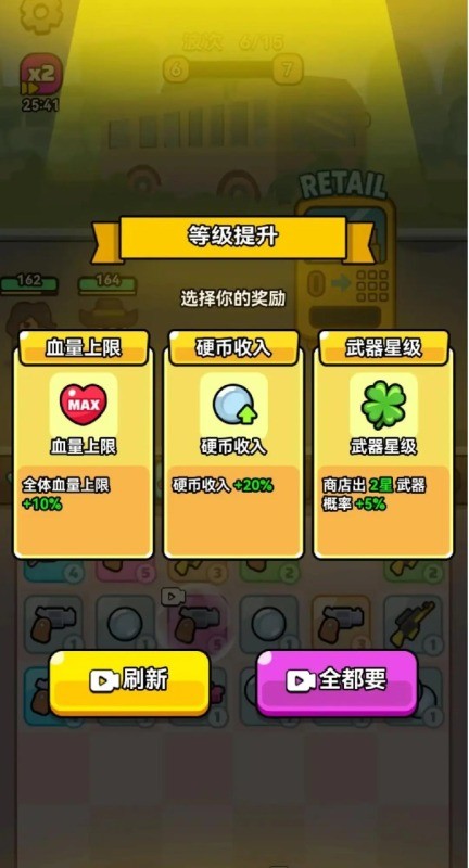 4、武器合成升级时,玩家可从攻击力提升、射速增强、弹药容量扩大等三个BUFF中选择一个,这种分支式成长让每局游戏都能形成独特的战斗风格。