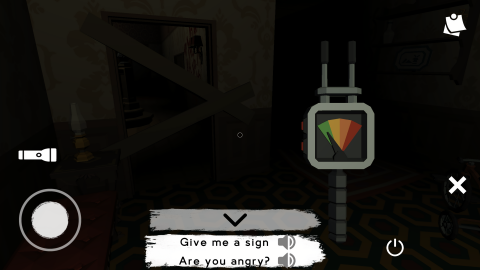 6、接着按隐藏栏发出声音向它提出问题(歪果仁也真是挺胆大的),此时灯一黑就来到了这款游戏最惊悚的地方。
