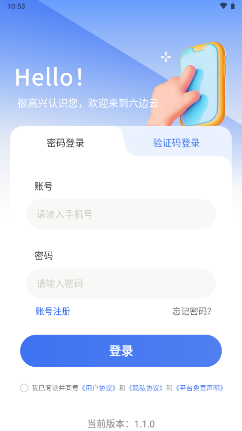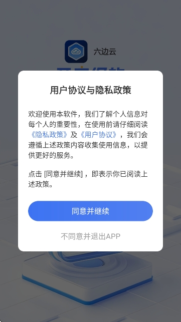 1、打开六边云手机APP,首先会弹出“用户协议与隐私政策”提示框,点击“同意并继续”表示阅读并同意相关协议,可进入APP;点击“不同意并退出APP”则退出。