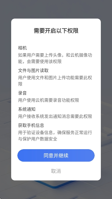 2、APP会请求开启相机、文件与片读取、录音、系统通知、获取手机信息等权限,点击“同意并继续”授予权限,可正常使用APP功能;点击“取消”则不授予权限,部分功能可能无法使用。