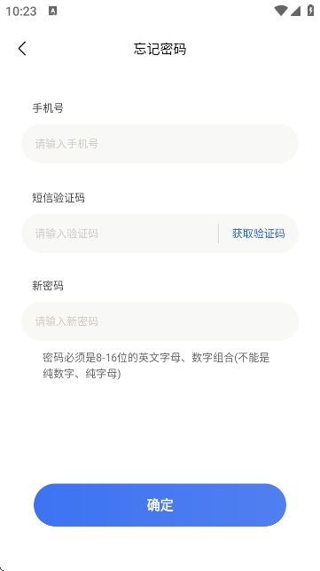 5、进入忘记密码界面,输入手机号,点击“获取验证码”并输入短信验证码,设置新密码(要求同注册时的密码),点击“确定”完成密码重置。