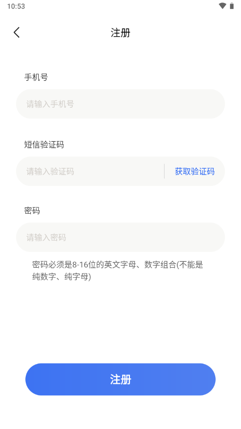 4、进入注册界面,输入手机号,点击“获取验证码”并输入短信验证码,设置符合要求的密码(8-16位英文字母、数字组合,不能是纯数字或纯字母),点击“注册”完成账号注册。