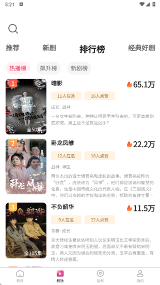 4、在排行榜页面中可以了解热播榜、飙升榜以及新剧榜等不同的排行。