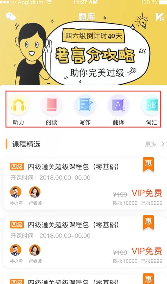 2、登录后进入题库页,利用听力阅读等功能备考四六级,借助课程精选板块学习通关课程提升能力。