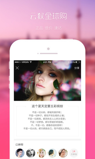云猴全球购是一款非常优质的手机购物软件。软件内拥有海量的精品商品,优选大牌,质量有保障,让你买的放心用的安心。软件内商品全面广泛,你想买的这里都有,并且都是超级优惠的价格,比其他地方便宜不少哦!还有超多种草合集,快来试试吧!