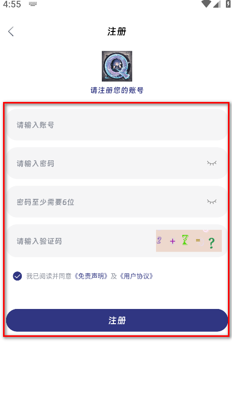 4.请输入账号、密码、再次输入密码、验证码,勾选我已阅读并同意《免责声明》及《用户协议》,再点击注册即可。