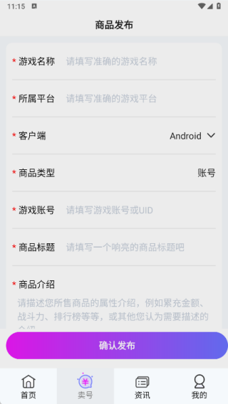 3、在卖号的页面中输入游戏名称、游戏平台、游戏账号、商口标题,商品介绍,最后确认发布即可;