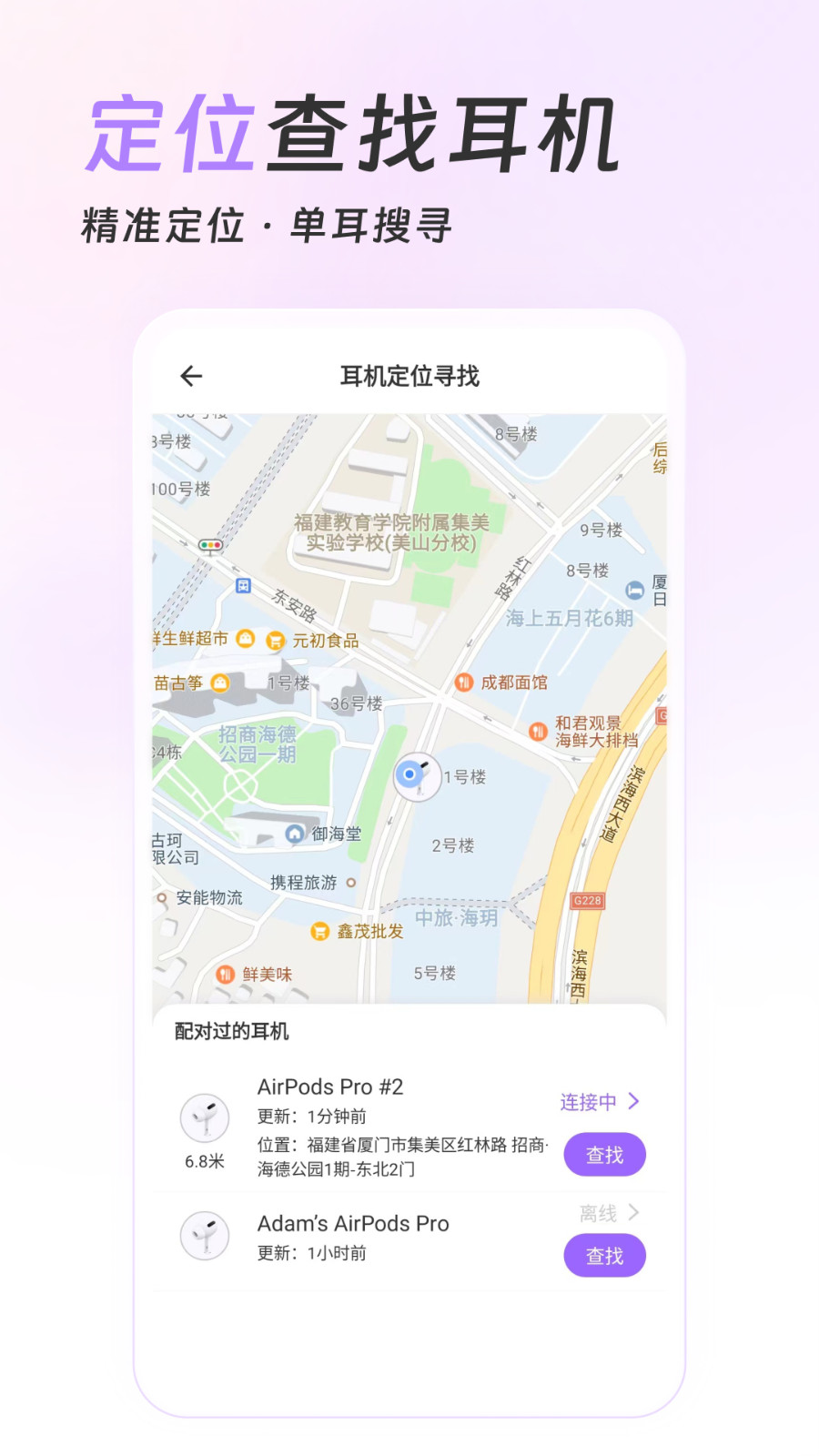 提供了蓝牙耳机设备的位置定位,用户能够通过定位来对耳机进行位置查询;