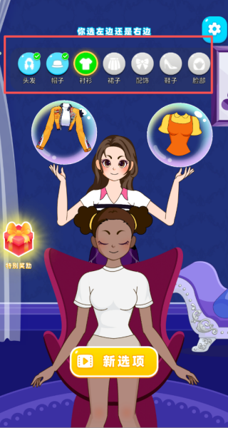 1、根据关卡主题从提供的服装中挑选搭配,通过点击即可完成换装操作。