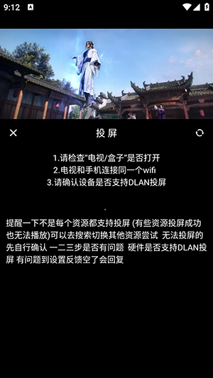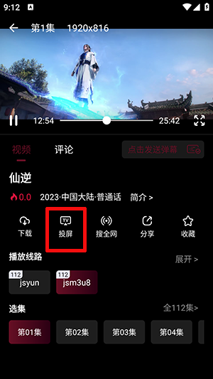 2、在播放页面,如果无法加载可以切换播放源,点击投屏功能。