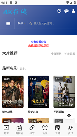 4K在线追剧app是互联网用户打造的一款影视平台,它里面提供了大量影视资源内容,在里面可以查找到动漫,电影,电视剧,综艺等影视内容,可以靠搜索来找自己喜欢看的影视剧作,软件整体经过去广告处理,点击影视作品即可播放,无需等待开头广告,体验感非常好,赶紧下载试试吧。