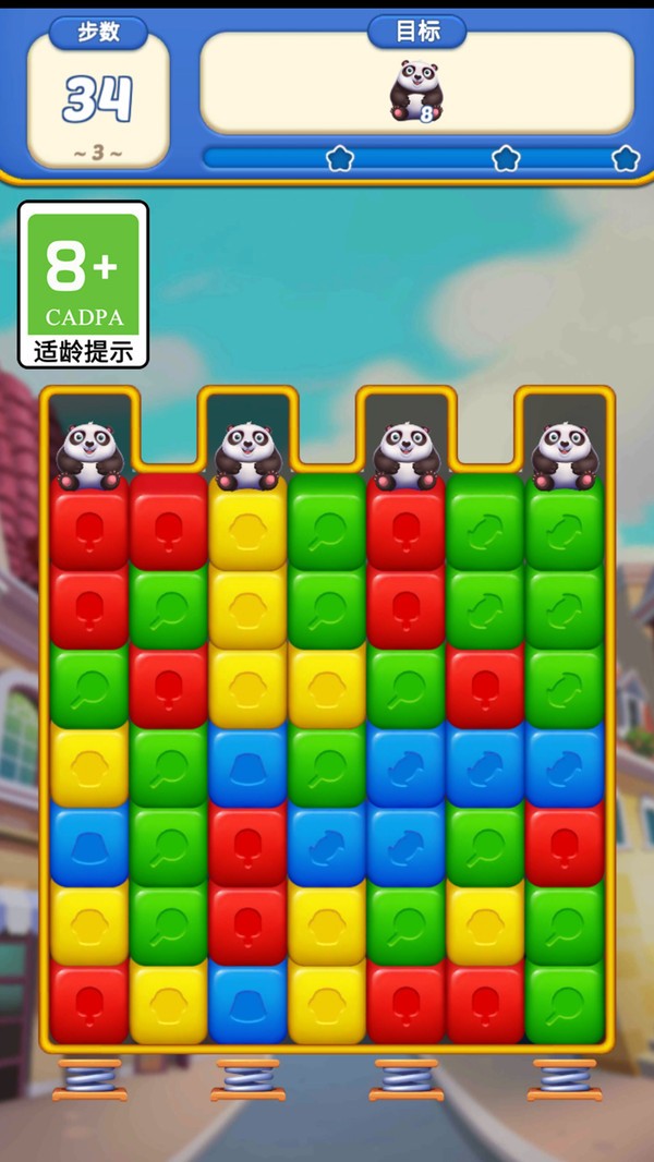 2、每关需要收集的熊猫数量会动态显示在顶部进度条,需通过连锁消除同时激活多只熊猫。