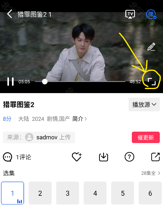 1、点击想投屏的影视内容进入播放界面,点击最上方播放画面任意位置,然后点击左下角的如图所示按钮