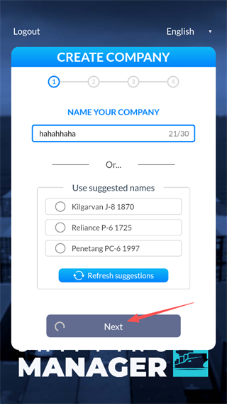 1、游戏开局,设置自己航运公司的名称,随后u点击“NEXT”。