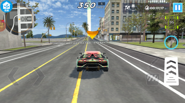 2、通过左侧虚拟方向盘控制移动,右侧按键操控油门、刹车与氮气加速。