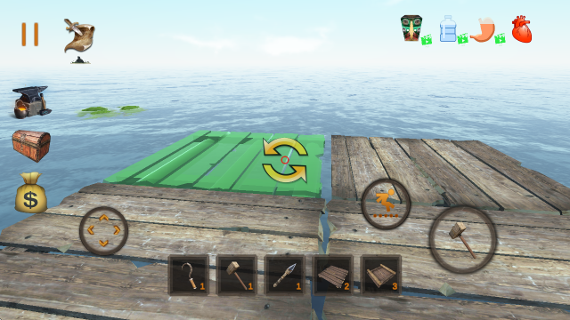 3、用钩子钩起材料建造你的木筏,使其越来越大,还要和海中的生物进行战斗。
