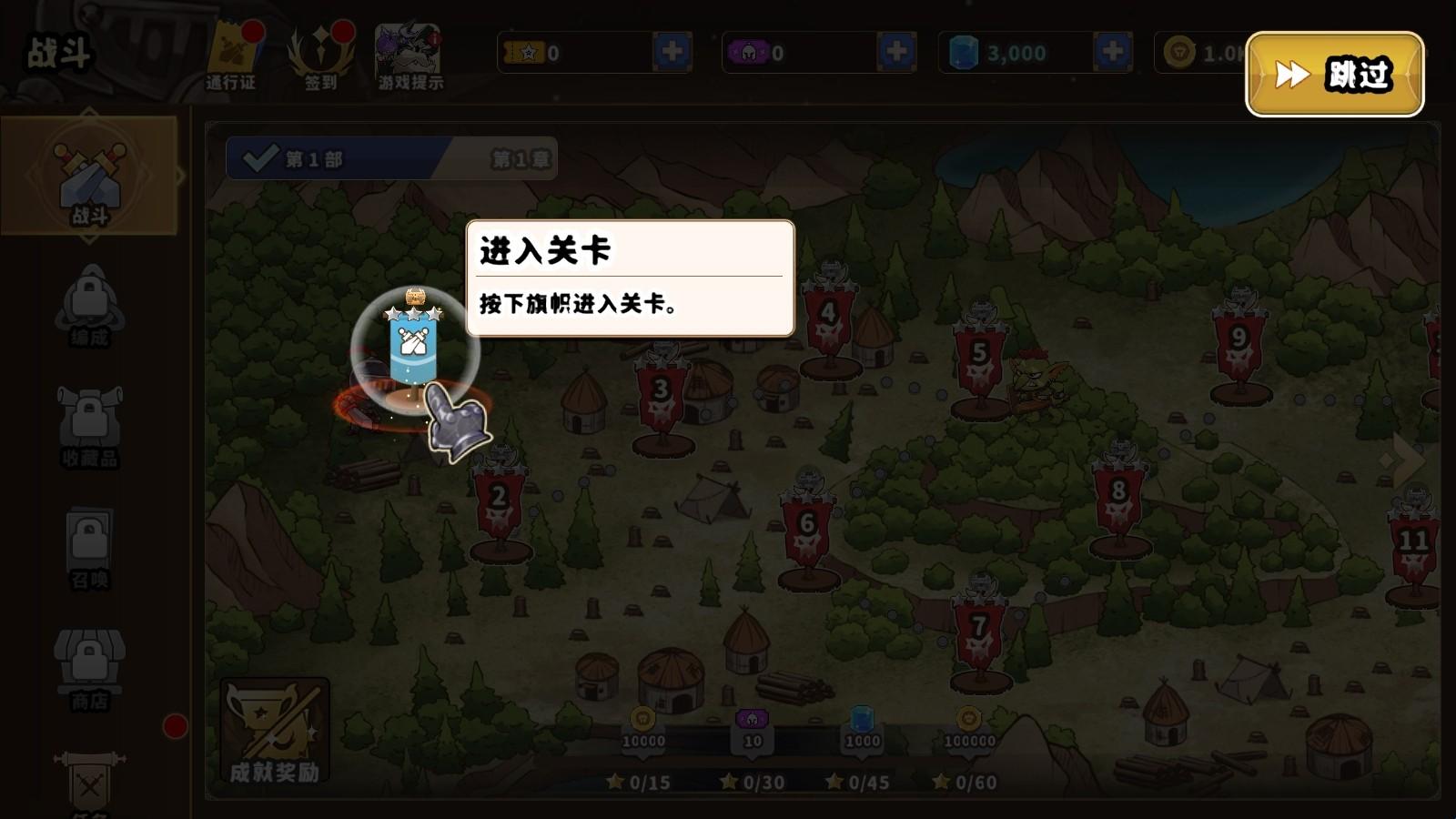 2、先点击旗帜进入关卡,按下进入按钮开始战斗。