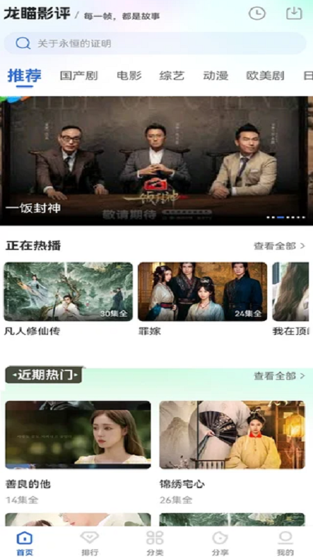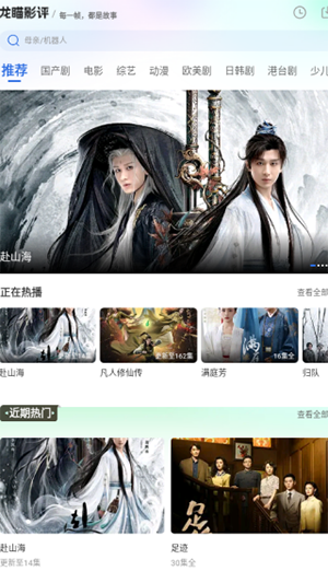 首页: 提供了推荐的各类影视,还可以了解近期热播的各类影视,同时有电影、动漫等不同的分类。