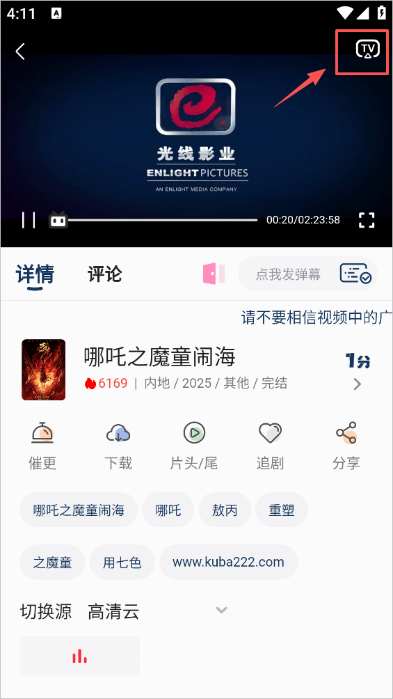 2、在播放界面内轻触屏幕唤醒菜单,并点击右上角TV图标