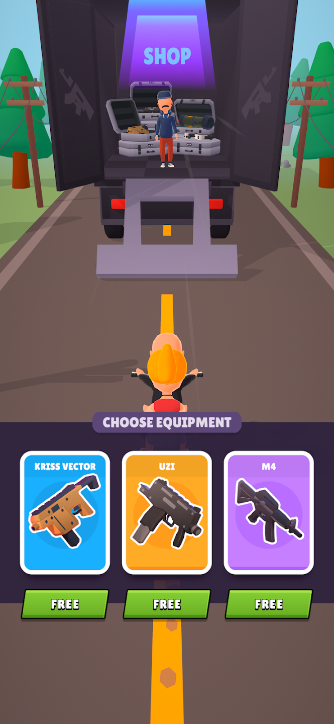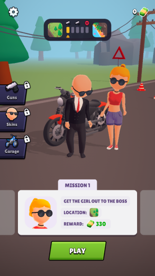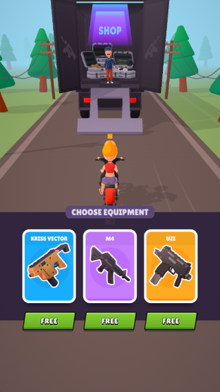 1、在游戏主界面,玩家可以更换枪械、角色皮肤以及摩托车等,更换好之后点击“play”即可开始闯关。