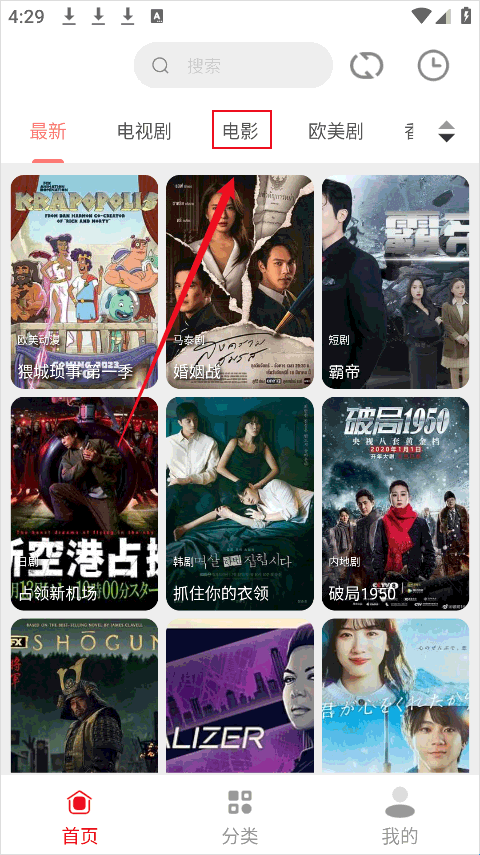 1、首先下载最新版本的十里视频,然后点击上方的电影