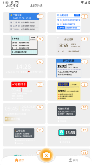 1、在首页中有拍照水印、拼图汇总以及自定义水印、边拼边拍、自拍水印等功能;