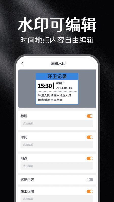 2、提供自定义水印功能,用户可以自由编辑和选择水印内容,如时间、地点、海拔、经纬度等,还能自定义标题、颜色和大小。