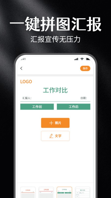 4、在拼图汇报里面选择logo图片、输入相关的工作汇报信息,上传图片和文字,最后进行保存即可。