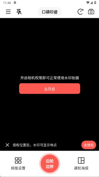 1、打开软件可以开启相机权限,然后进行快速的水印拍摄;