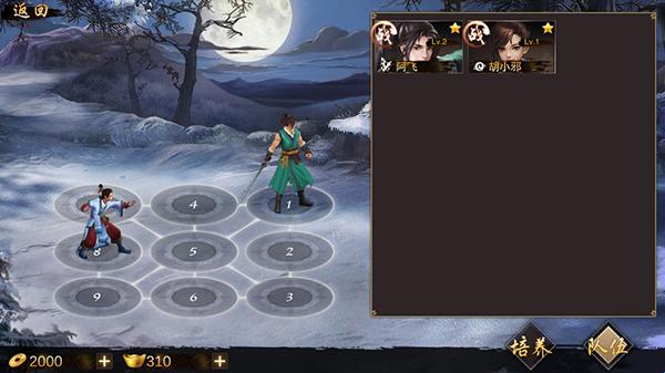 关键提示:初始阶段尽量获取四个英雄中的三个,最后一个可以通过元宝在老板娘处购买,五个一次性入手效果最好,后期抽卡获得难度较大,记得准备足够的元宝。抽卡没有保底机制,消耗大量元宝也常常不会有好结果,氪金玩家也未必能保证成功。此为外功队阵容,其中上官玄火可提供外功结界,胡老邪则为内功结界,两者可以根据战斗需求选择搭配。