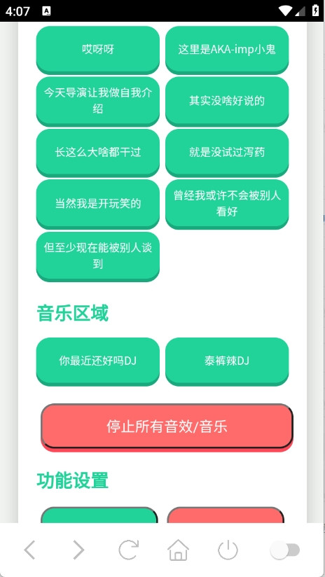 3.如果不想听了,就可以点击停止所有音效/音乐。功能设置区域的功能也是可以直接点击使用的哈。