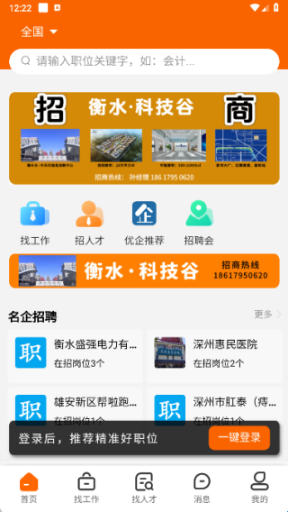 1、在首页中提供找工作、招人才、优企推荐和招聘会,同时了解名企招聘的功能;