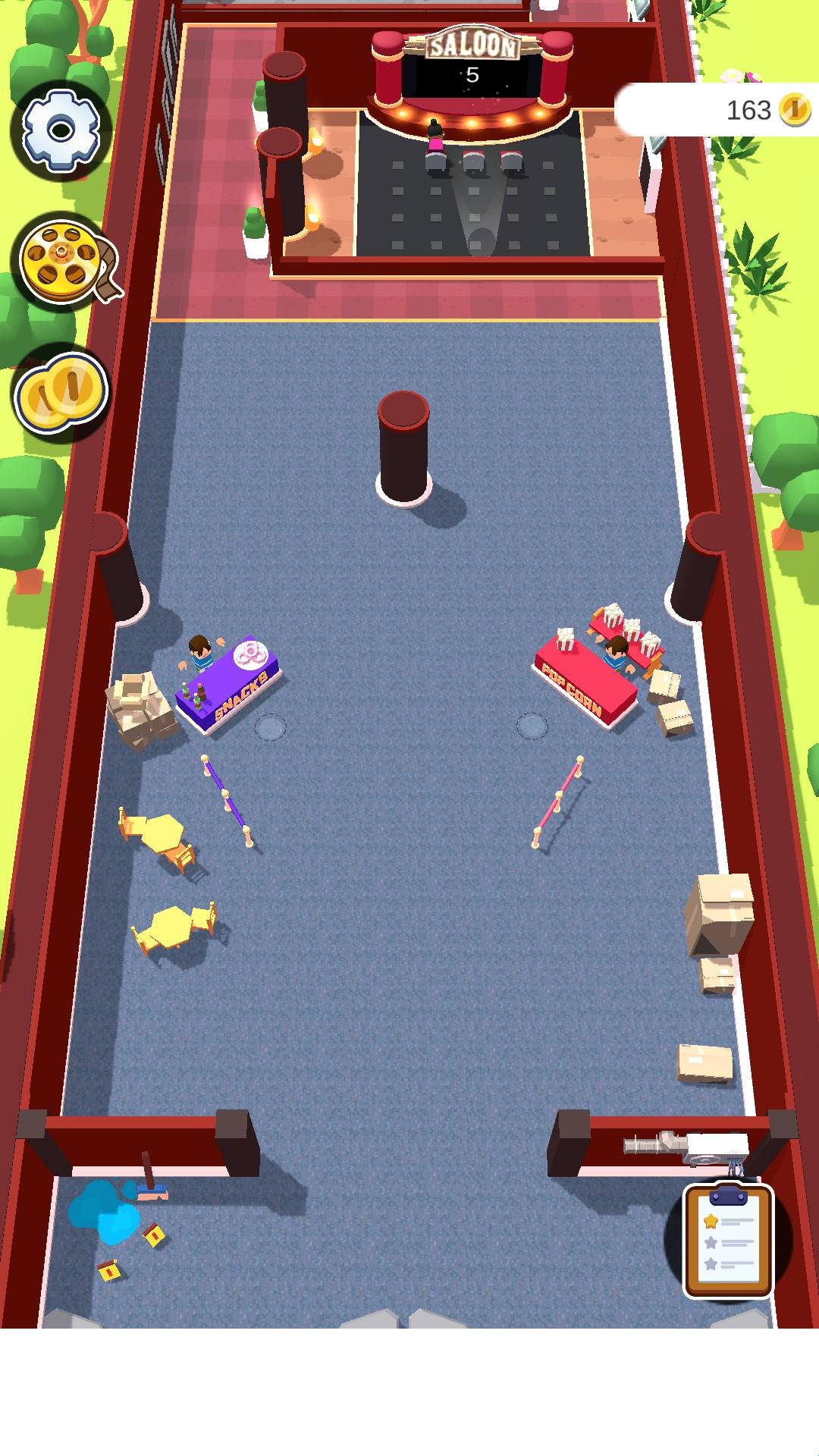 1、卡通风格的模拟经营游戏,开设一家电影院吸引人群来看电影;