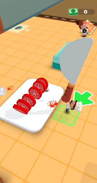 2、在工作台使用特制切菜刀,按照虚线提示完成精准切割,每次完美切割可获得额外评分。