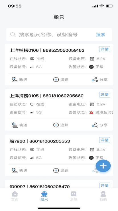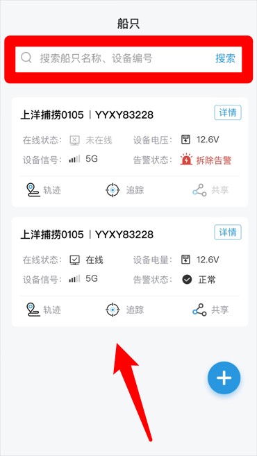 4、船只列表页支持按名称或编号搜索,并可点击追踪按钮实时查看船只轨迹和状态信息。