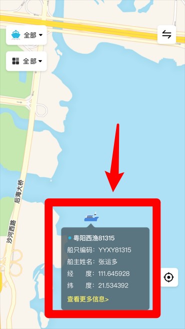 3、地图页面实时展示船只位置及详细信息,点击可查看船只编号、经纬度及船主姓名等重要数据。