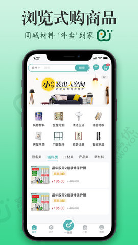 装修过程中需要的主材、辅料、设备、配饰、家居、家电等商品和材料应有尽有,系统智能推荐附近的商家商品。