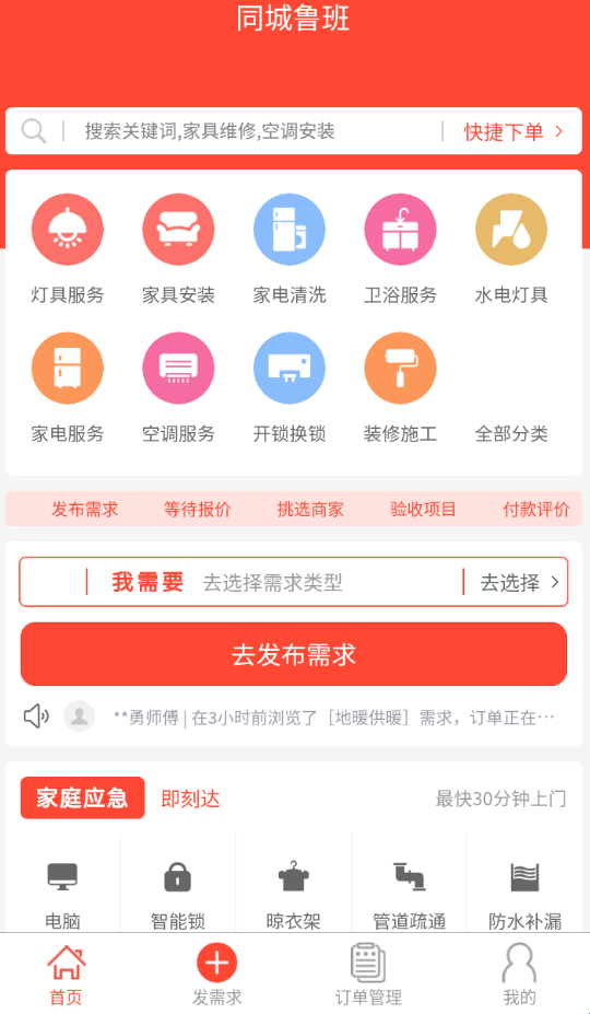 同城鲁班是一款提供家政上门服务的软件,软件为同城用户带来便捷、优质的上门维修、保洁、清洗等服务。软件设计简洁操作简单,用户可以直接在软件上发布各种家政需求,就会有专业人士极速上门,并且价格透明,服务优质。为用户生活带来更多便捷。