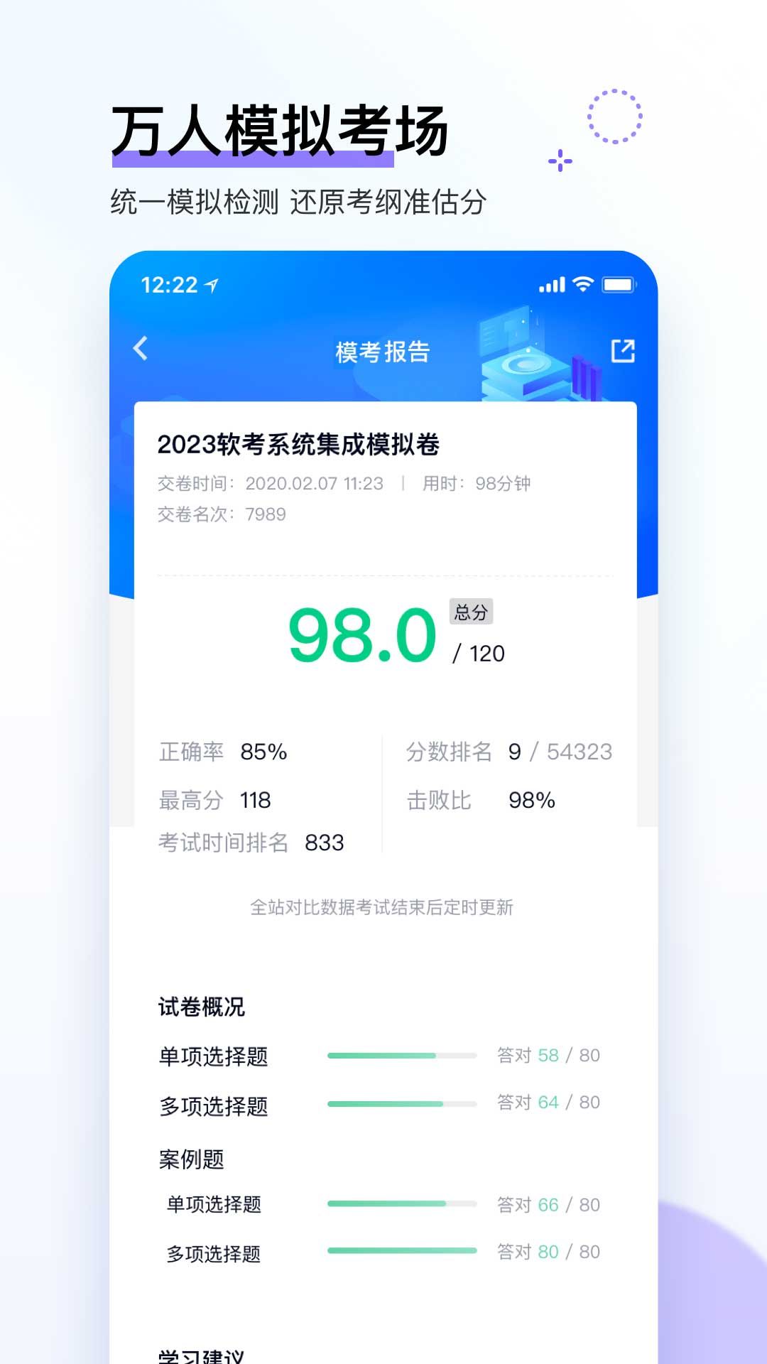 3、历年真题模拟:提供历年软考真题模拟,让用户模拟真实考试环境,帮助用户更加了解考试的难度和出题特点。
