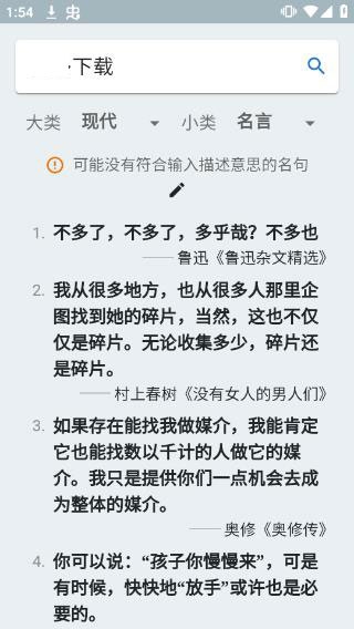 对应现代汉语名言名句,下分名言(指严肃经典名人名言)、佳句(包括当代文学、网文、现代诗歌、歌词等中的名句)、网络(来自网络的句子)、台词(包括影视剧、动漫、综艺等的经典台词);