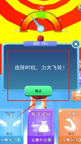 1. 游戏的指针是不断移动的,你需要找着时机在力量达到最大点的时候点击确认。将砖抛飞出去。