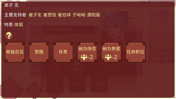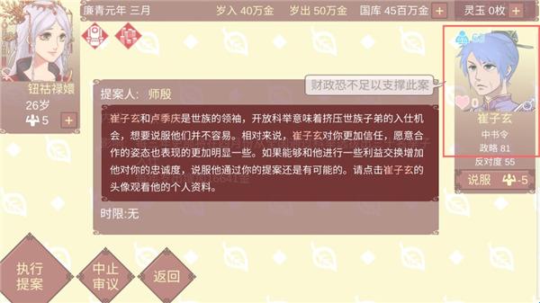 12、崔子玄和卢季庆是世族的领袖,开放科举意味着挤压世族子弟的入仕机会,想要说服他们并不容易。相对来说,崔子玄对你更加信任,愿意合作的姿态也表现的更加明显一些。如果能够和他进行一些利益交换增加他对你的忠诚度,说服他通过你的提案还是有可能的。请点击崔子玄的头像观看他的个人资料。