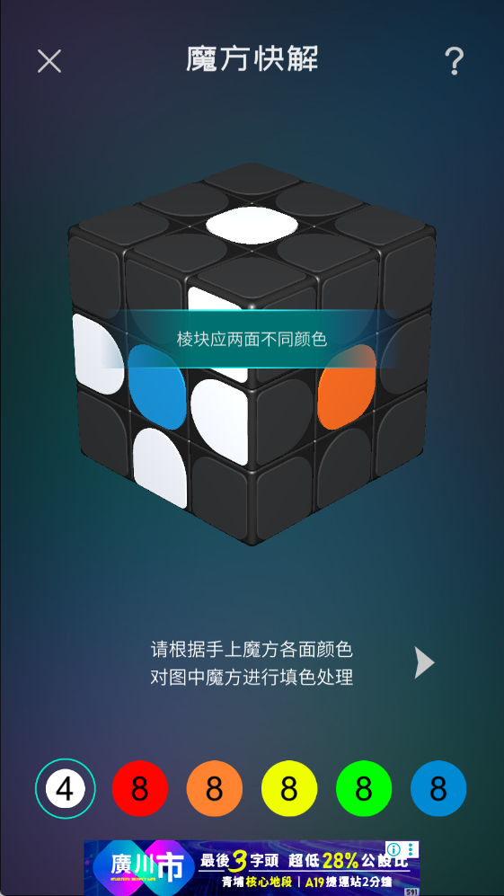 3. 在魔方快解功能中,根据提示对魔方各个方块进行颜色填充,系统会自动分析出最佳解法步骤,适合遇到困境时快速还原魔方。