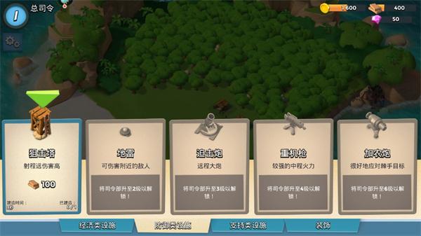 玩家在海岛上建造自己的民房、兵营、炮塔、采石场、木材场等建筑设施,并为这些设施装备机枪、大炮、火箭发射器等武器装备,足以让玩家正真的创造属于自己的海岛世界。