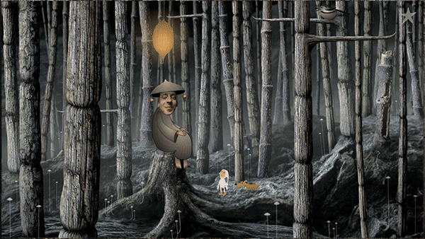 点人,要帮他找到烟斗。点斗笠上的铃铛,把它挂到那只鸟停着的树枝的左端,趁鸟飞起来的时候,点它的窝,烟斗掉下来。把烟斗给人。再帮他找烟袋。点人坐着的树桩下面的洞,狗跑进洞里。狗跑到怪物面前停下来,点狗身后的植物,狗就xuxu,植物就会长高(这个设计挺幽默)。然后点左边的水塘,狗跑过去喝水,回来再点植物。这样2、3次,植物长到顶端会有一个洞,点里面的骨头,给怪兽。烟袋藏在怪物后面的草堆里,找到烟袋,带上来给人。人点烟的时候会放出上面灯里的小飞虫,点飞虫就会为小人领路。过关。